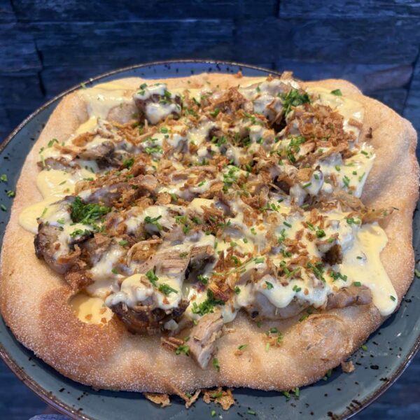(homemade pulled pork, garlic, bbq sauce, young onions)