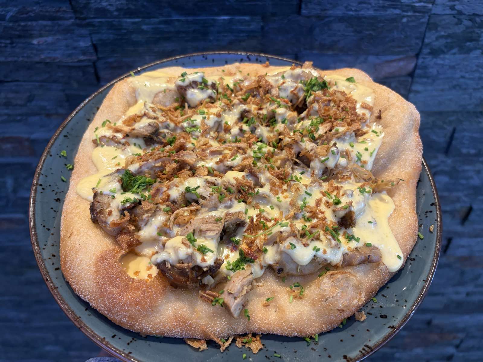 (homemade pulled pork, garlic, bbq sauce, young onions)