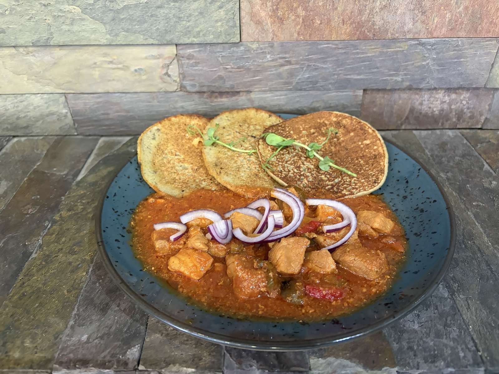 1. 120g fried pork schnitzel, 200g mashed potatoes with bacon and onion (1,3,7)