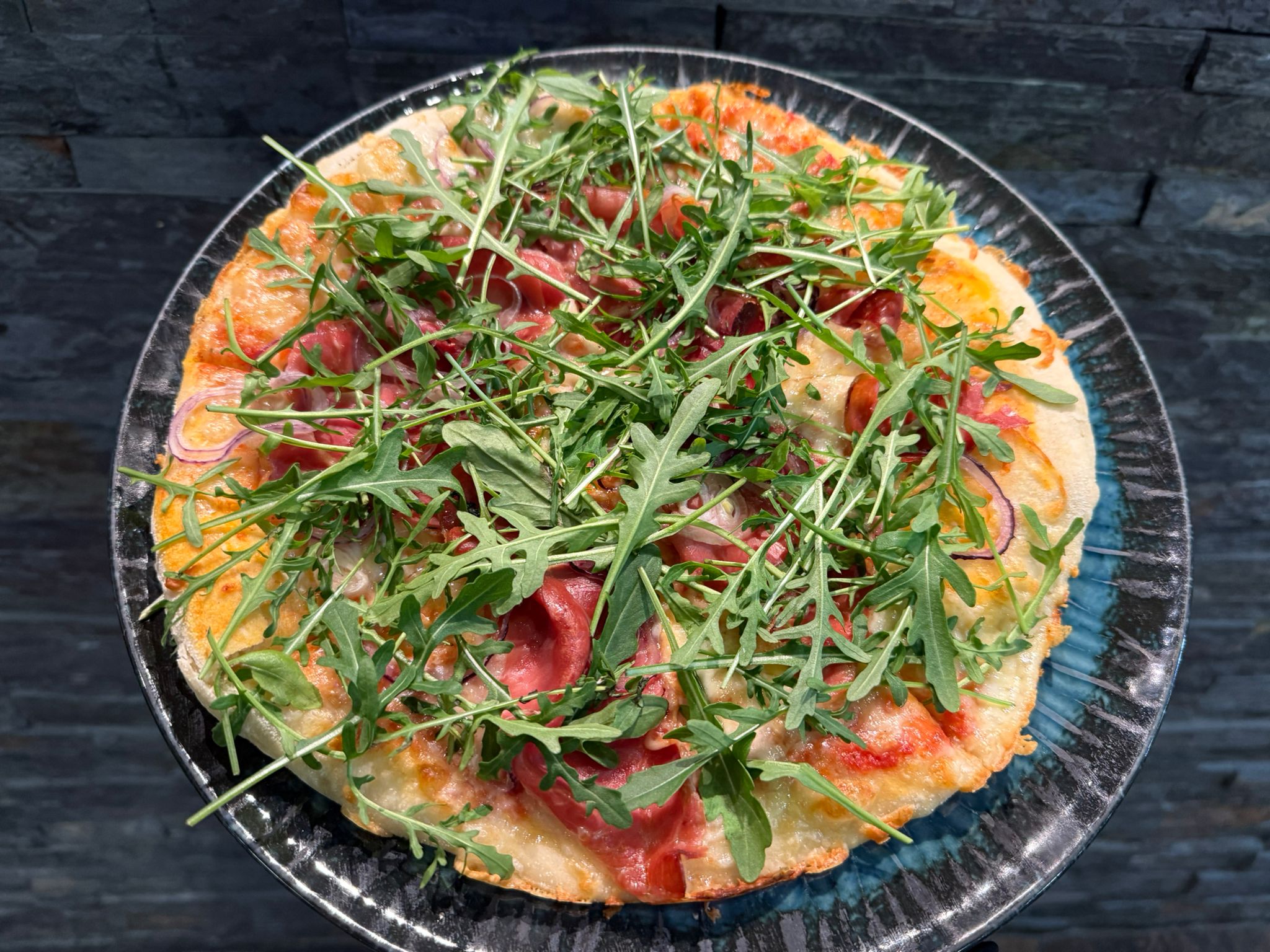 salsa, cheese, prosciutto, red onion, arugula