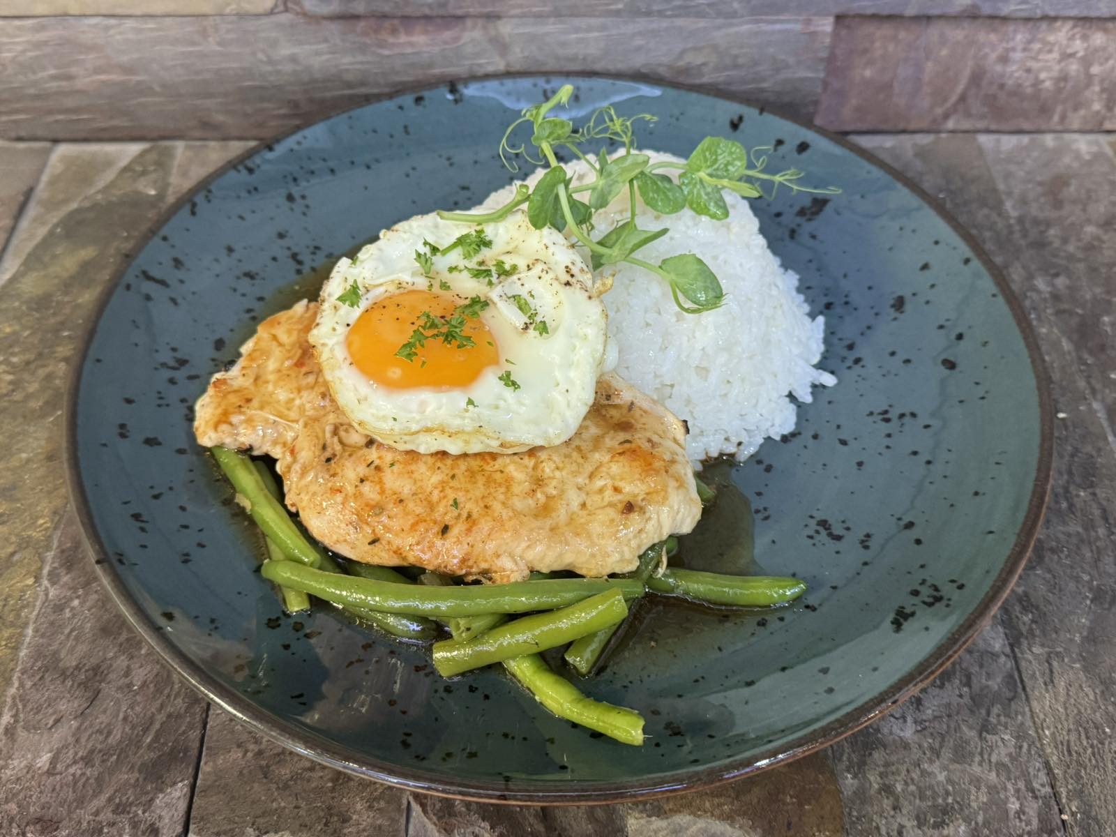 1. 120g Kurací plátok prírodný na fazuľových luskoch, volské oko, 180g ryža (3)