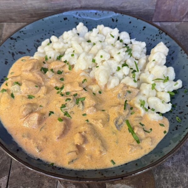 2. 120g Bravčový stroganov, 200g domáce prílohové halušky (1,3,10)