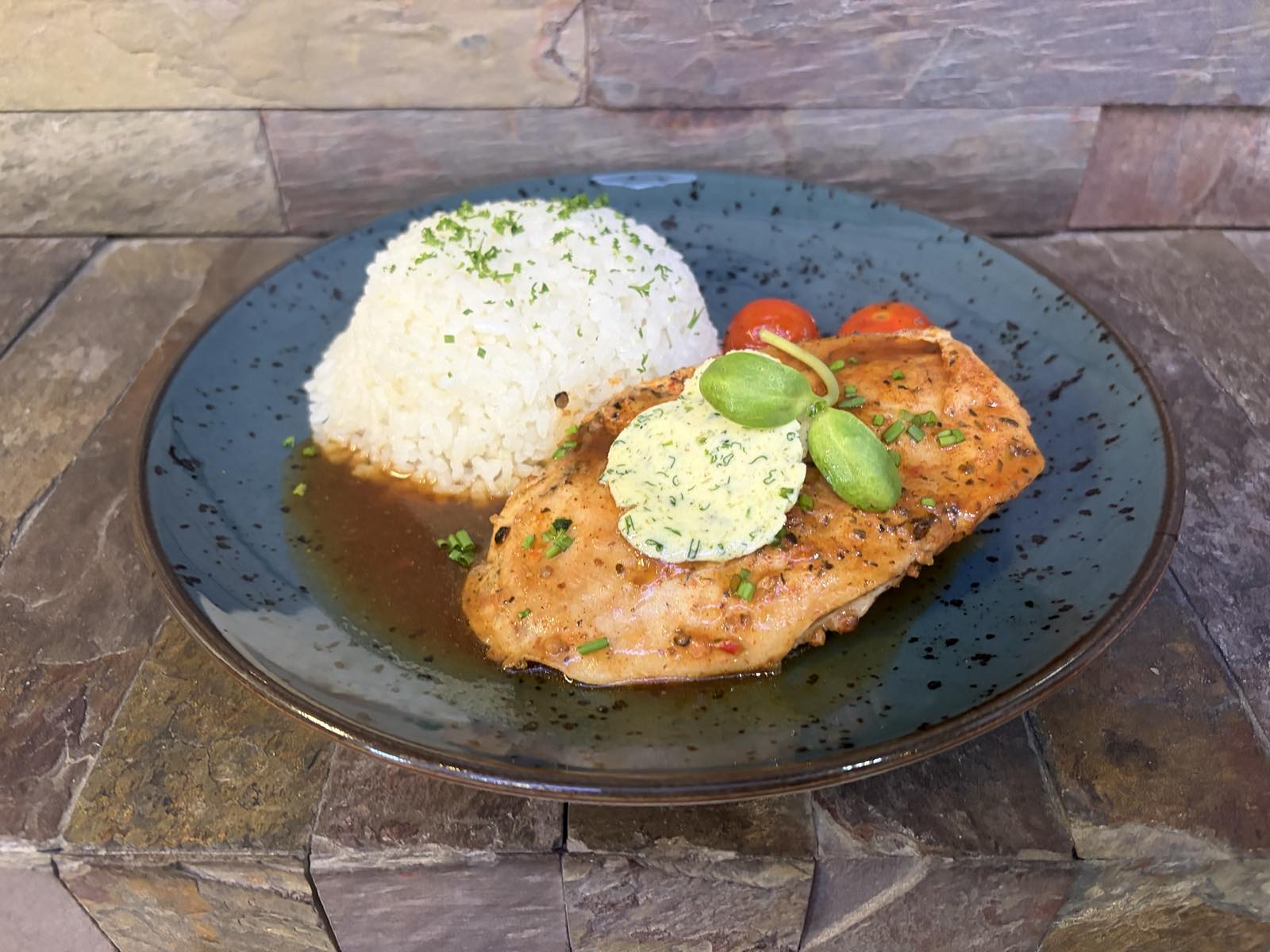 2. 120g Kuracie prsia prírodné s bylinkovým maslom, grilované cherry paradajky, 180g ryža (7)